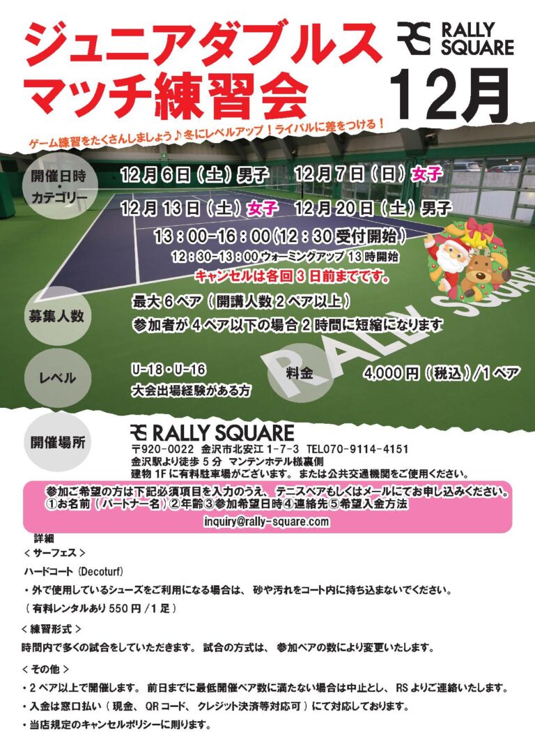ジュニアダブルス練習会 2025.11.16 NEWS 試合が少ない北陸のジュニアテニスプレーヤーの皆さんにとっては、 練習量が減ってしまう、とても辛い時期がやってきますね… そんなジュニアプレーヤーの皆さんが参加できるダブルス練習会をご用意いたしました! 経験を積む場として、お友達やパートナーを誘って是非ご参加ください! Past 記事一覧 NEWS(17)