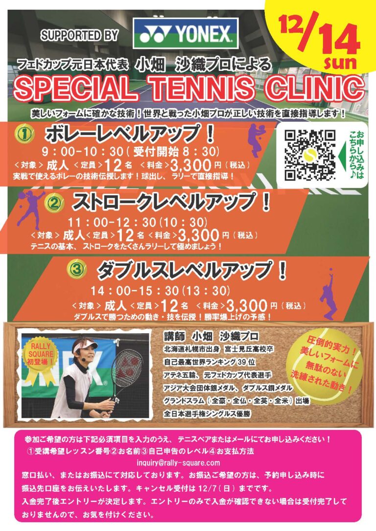 12月14日(日)小畑沙織プロによるスペシャルテニスレッスンを開催いたします。
