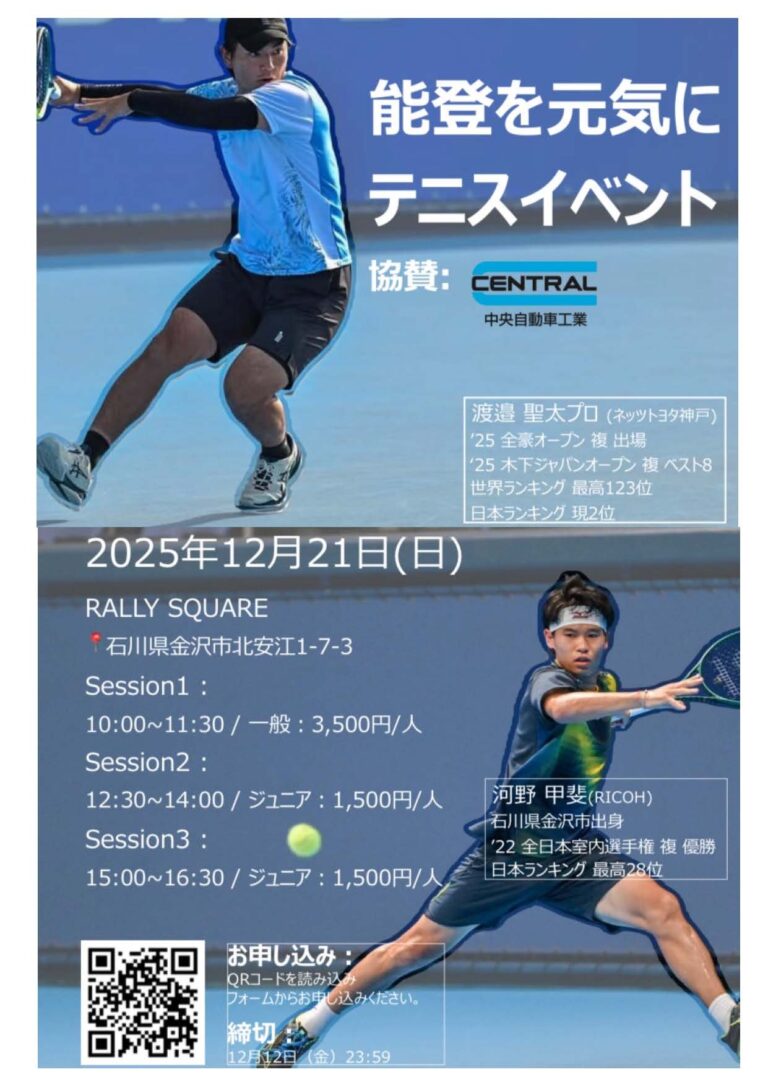 「能登を元気に!」と題して、石川県に所縁のある河野選手がラリースクエアでテニスクリニックを開催します。