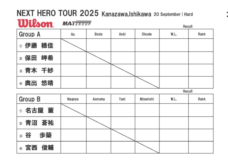 NEXT HERO TOUR 2025 石川大会第二回ドロー 2025.09.13 NEWS NextHeroTour2025 in石川予選大会のドローを掲示します。 大会参加の皆様はご確認よろしくお願いします。 尚、グループリーグ終了後トーナメントにて、全国大会に参加できる2名を決定します。(補欠1名3位の選手) 当日はWilson商品を忘れることの無いよう再度ご確認よろしくお願いします。 Past 記事一覧 New NEWS(14)