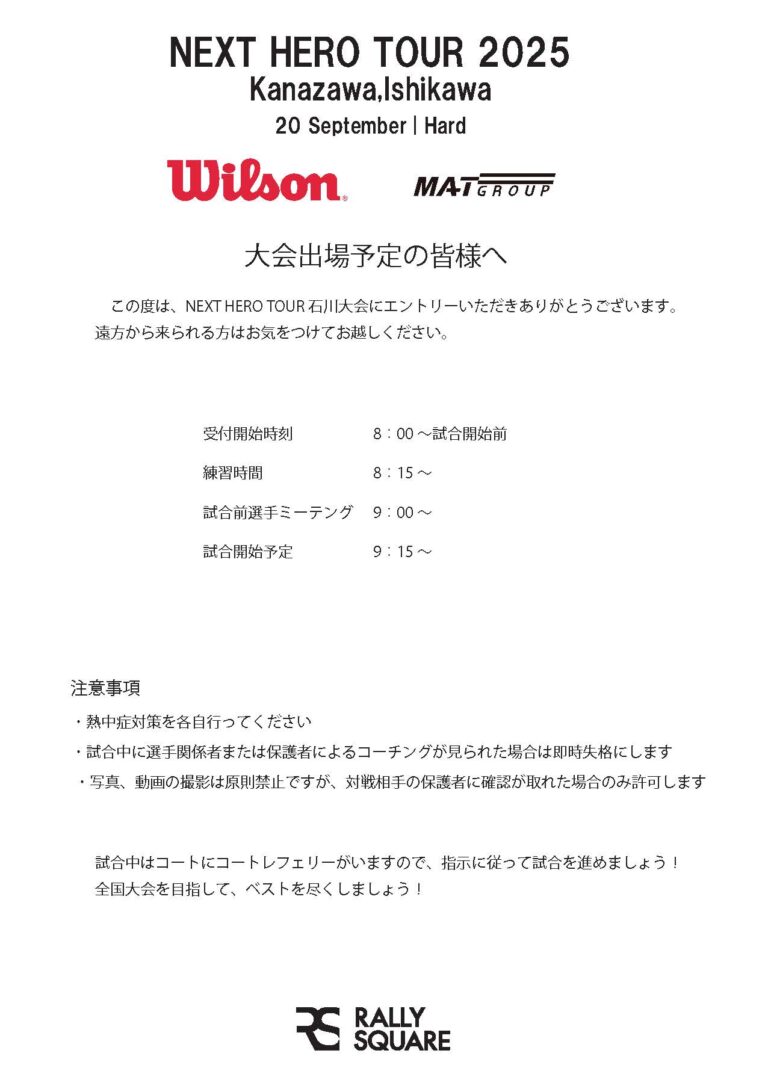 NextHeroTour 石川大会 第二回 当日の流れについて 2025.09.13 NEWS 試合に参加される皆様へ 当日の試合までの流れになります。 ご確認ください。 RALLY SQUARE Past 記事一覧 NEWS(14)